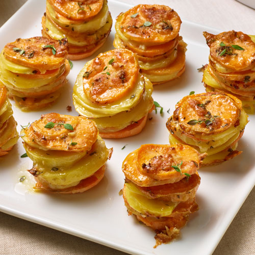 Grease a 12-cup muffin pan. In large bowl, whisk together butter, ¼ cup parmesan, garlic, thyme, ½ teaspoon salt and pepper. Add potatoes to butter mixture; stir to coat. Evenly stack potato slices alternating Yukon and sweet potatoes evenly in muffin wells. Pour any leftover butter mixture over stacks. Sprinkle with remaining parmesan and salt.