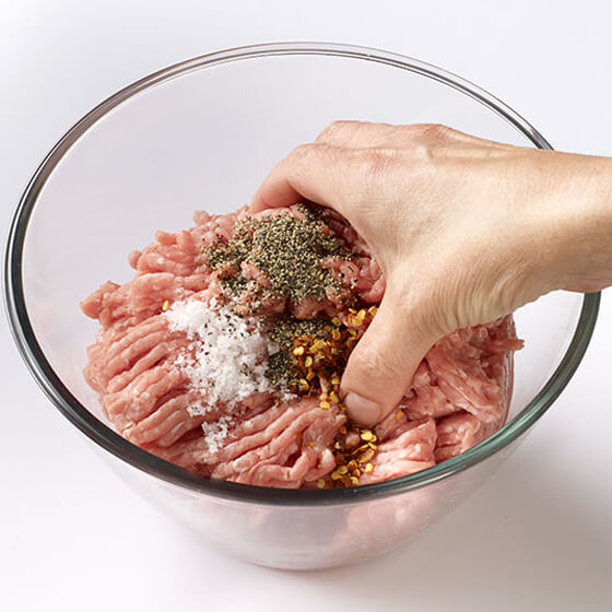 Take off your rings, wash your hands and dig in. Mix the ingredients, but don’t over mix the ground meat, which can make it dense and tough.
