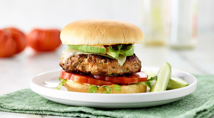 In bowl, combine ground turkey, ¼ cup mayonnaise, crackers, egg, onion, poblano pepper, cilantro, garlic salt, paprika and cayenne pepper. Divide mixture into 4 portions and shape into patties. Refrigerate 15 minutes. In skillet over medium-high heat, cook burgers in oil. Cook burgers as specified on the package. Always cook to well-done, 165°F as measured by a meat thermometer. During last 2 minutes of cooking, top each burger with cheese slice. In bowl, combine mayonnaise, lime zest, lime juice and Siracha sauce. Spread cut sides of each roll with mayonnaise mixture. Top bottom bun with lettuce, tomato, burger, avocado and bun top. Serves 4.