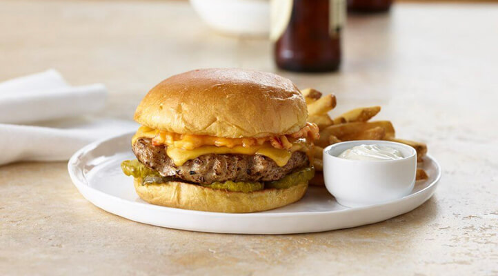 Divide ground turkey into 4 portions and shape into patties. Prepare grill for high direct heat. Grill burgers 8 to 12 minutes, turning once. Always cook to well-done, 165°F as measured by a meat thermometer. During last 2 minutes of cooking, top each burger with 2 cheese slices. Place 5 pickle slices on each bun bottom. Top with burger, pimento cheese and bun top. Serves 4.