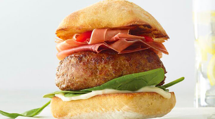 This tasty Italian burger recipe takes a lean turkey patty and dresses it up with garlic and lemon juice, tops it with veggies and prosciutto, and still manages to come in under 350 calories per serving. Classy!